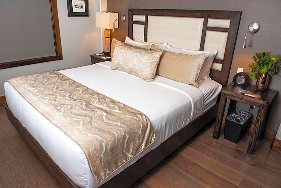 The Cable Mountain Lodge offers a variety of room types including King Studio for single occupancy with a 1 King bed and a room size of 355 sqft. The Classic Hillside Suite is a Family room with a King bed and a sofa bed, accommodating 1 adult and 2 children in a 753 sqft space. The Luxury Suite is available for single occupancy with a King bed and a sofa bed, suitable for 1 adult and 1 child.