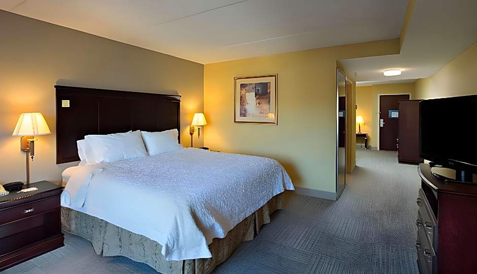Two-room, whirlpool, HDTV, sofa bed, free WiFi, refrigerator, microwave, coffeemaker, wet bar Relax in this warm and welcoming two-room suite. The living area features a sofa bed and comfortable soft seating, while the bedroom area contains one king clean and fresh Hampton bed®. Unwind and watch the 32-inch LCD HDTV, stay on top of business at the desk and keep up-to-date with free WiFi. Enjoy the convenience of the microwave, refrigerator, coffeemaker and wet bar. The bathroom includes a shower with curved rod; allowing for more space as well as a soothing whirlpool tub.