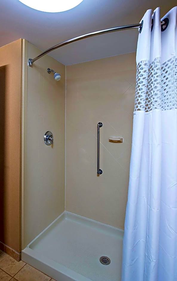 This spacious non-smoking hearing accessible room features one king-sized bed, convenient sofa bed, 32-inch LCD HD television, easy to operate alarm clock/radio and large work desk. The room also has a visual alarm, and notification devices for the door knock and incoming telephone calls. The WiFi access will help you stay connected while on the road. If you prefer not to work at the desk, you can use the convenient lap desk instead. You'll also enjoy the convenience of having a coffeemaker and iron/ironing board in your room. In the bathroom you'll enjoy fluffy towels, a WaterPik showerhead and curved shower rod that allows more light and space in the shower. This room has no bathtub. Any corresponding photo may not reflect the specific accessible room type or room feature.