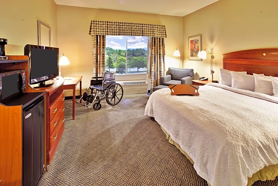 This mobility and hearing accessible, non-smoking room features one king-sized bed, and an accessible roll-in shower. The room also has a visual alarm and notification devices for the doorbell or door knock and incoming phone calls. The room features comfortable soft seating, a 32-inch HDTV, and easy to operate alarm clock/radio. The free WiFi will help you stay connected while on the road. If you prefer not to work at the desk, you can use the convenient lapdesk instead. You'll also enjoy the convenience of having a coffeemaker with tea service and iron/ironing board in your room. Any corresponding photo may not reflect the specific accessible room type or room feature.