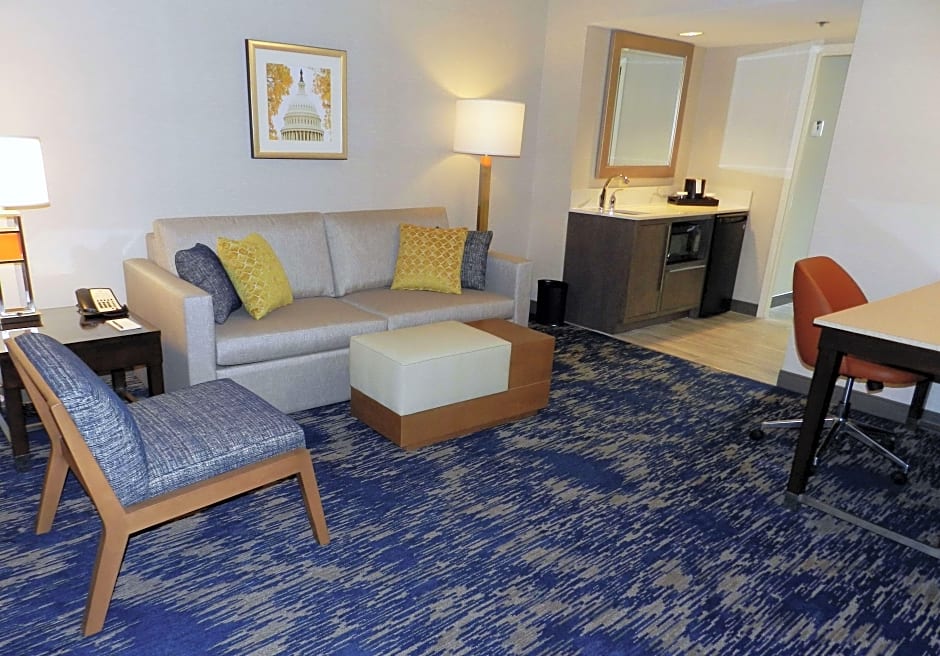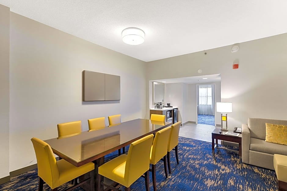 In-suite drinks and snacks, WiFi, Keurig coffeemaker. This two room suite features a private bedroom and separate living room. The living room features a sofa bed, television, refrigerator, microwave and dining or work table. The bedroom includes a king-sized bed, television and alarm clock with MP3 connection. A free made-to-order breakfast and Evening Reception with cocktails and snacks is included. (Must be of legal drinking age) In-suite drinks and snacks, WiFi, and Keurig coffee brewer are all included in our Premium Suites.