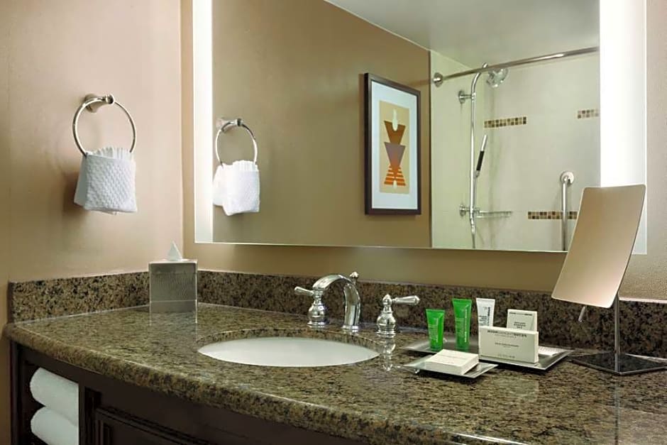 This mobility accessible executive level room features one king-sized bed and an accessible tub. Club Level guests enjoy key access to the Private Executive Lounge located inside our Dan & Brad's Restaurant on the Mezzanine Level. The Executive Lounge amenities includes breakfast service (Mon-Fri), afternoon snacks, beverages, evening hors d'oeuvres, and honor bar (Sun-Thu) plus free WiFi. This beautifully decorated room features maple woods furnishings, rich fabric, 32-inch HDTV programming, alarm clock radio with MP3 connection, chair with ottoman, workstation, two-line phone with voicemail, high-speed WiFi access, coffeemaker, iron/iron board, high-powered mount-free hairdryer, in-room safe and a mini-refrigerator. Any corresponding photo may not reflect the specific accessible room type or room feature.