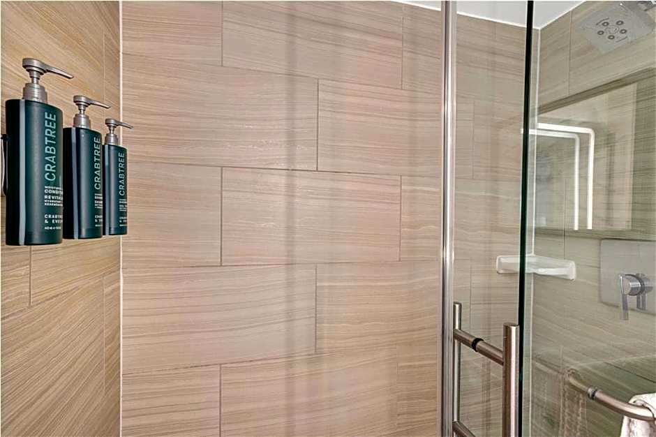 Corner room, Hilton Serenity bed, chair and ottoman, work desk, fridge, HDTV, and complimentary WiFi. Choose this spacious king bed corner guest room and experience ultimate comfort with our Hilton Serenity Bed. Catch up with work at the spacious desk, stay connected with WiFi, or enjoy a movie on the LCD TV with premium HD channels. Refresh in the bathroom offering deluxe bath amenities.