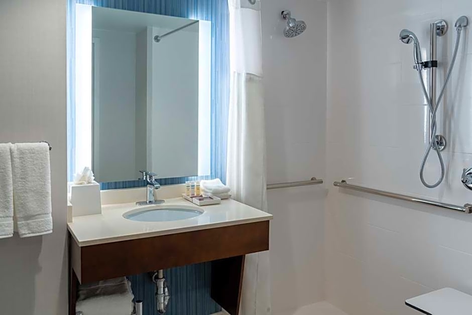 This mobility accessible standard room features one king-sized bed, and an accessible tub. This room offers the latest in technology and ergonomic comfort to our guests. Grab bar in tub with attached accessible seating, lowered vanity in bathroom, and lowered shelf in closet. And the pursuit of the perfect night's stay continues with an evolution of innovative new amenities including the bed, chair, television and crisp white duvet. The ergonomic chair is good for your back and better for work. Enjoy an in-room movie or your favorite television show on our 36-inch HDTV. There's also a microwave, refrigerator and coffee/tea maker to help you feel at home. And for conducting business, our rooms ensure your productivity thanks to the spacious work desk, two telephones. Any corresponding photo may not reflect the specific accessible room type or room feature.
