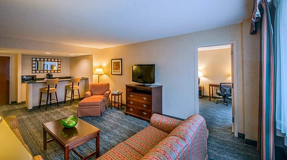 Suite features a separate living area and kitchen area including a microwave, refrigerator and sink.