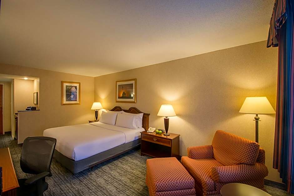 This accessible room features a flat-screen cable TV, disability accessible bath tub, a refrigerator, and a Kuerig coffee maker.