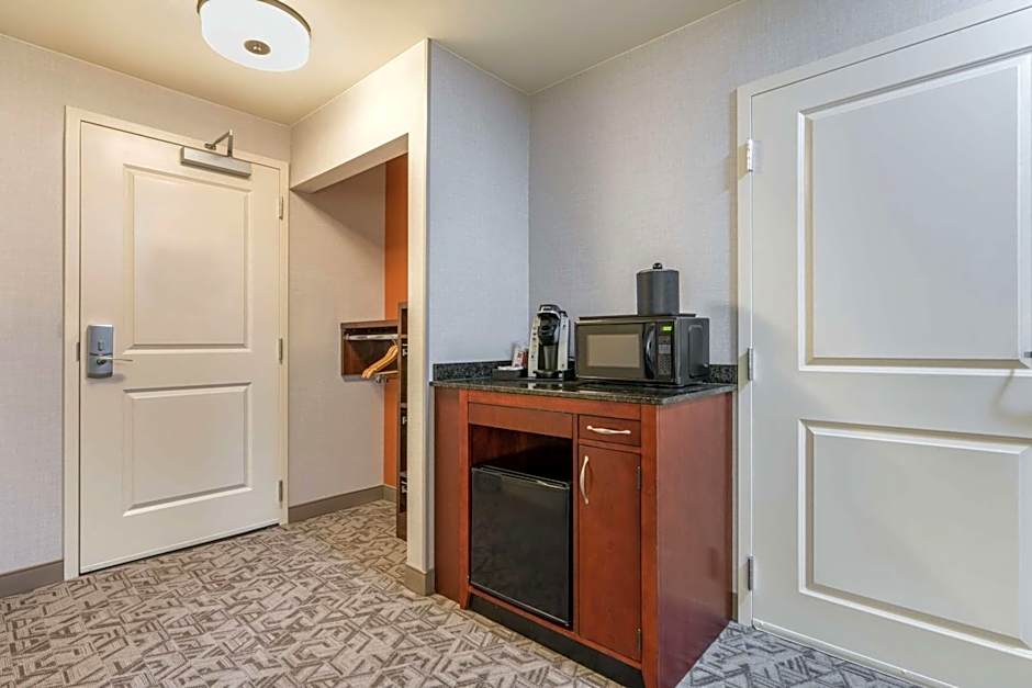 This guestroom has an accessible bathtub with grab bars, lowered vanity and shelf in closet, flat-screen TV and a hairdryer. A small refrigerator, microwave and coffeemaker are provided, as are ironing facilities and a work desk. The room also has a visual alarm. Notification devices for the doorbell or door knock and incoming telephone calls are provided.
