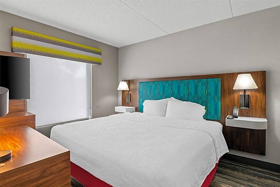 Accessible features, microwave, refrigerator, sofa bed, HDTV, work area, free WiFi Have a relaxing stay in this mobility and hearing accessible room that features a king-sized clean and fresh Hampton bed® and an accessible bath tub. The room has a visual alarm and notification devices for the doorbell or door knock and incoming phone calls. Feel at home with amenities including a microwave, refrigerator and tea/coffeemaker. The room also offers a plush sofa bed, 32-inch TV and a spacious desk with free WiFi. In the bathroom, you'll enjoy fluffy towels, a WaterPik® showerhead and curved shower rod for added space and light.
