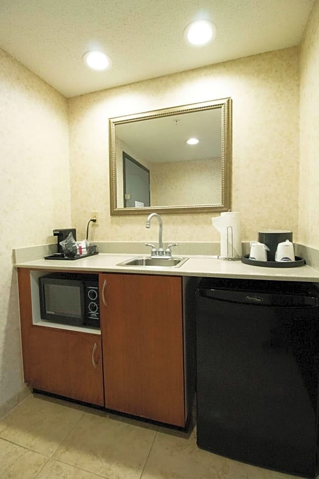 This hearing accessible, non-smoking suite with city view, features one king-sized bed. The room also has a visual alarm and notification devices for the doorbell or door knock and incoming phone calls. The room features our luxurious clean and fresh Hampton bed, comfortable sofa bed, microwave, refrigerator, a HDTV, and easy to operate alarm clock/radio. In the bath you will enjoy a WaterPik showerhead and curved shower rod. The free high-speed internet access will help you stay connected while on the road. If you prefer not to work at the desk, you can use the convenient lapdesk instead. You'll also enjoy the convenience of having a coffeemaker with tea service and iron/ironing board in your room. Any corresponding photo may not reflect the specific accessible room type or room feature.