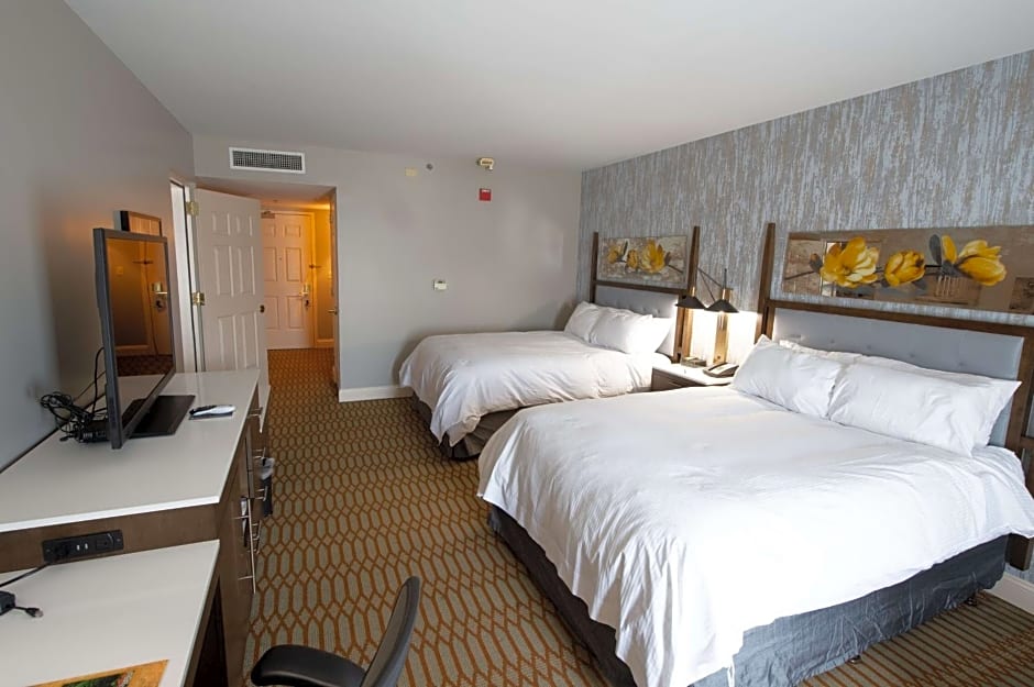 The Virginia Crossings Hotel offers several types of rooms. These include Queen Rooms with Two Queen Beds and a roll-in shower for mobility and hearing access, Queen Rooms with Two Queen Beds, Queen Rooms with Two Queen Beds for hearing access, King Rooms with no accessibility features, King Rooms with a roll-in shower for mobility and hearing access, and King Rooms with an accessible tub for mobility and hearing access. The rooms are all around 355 square feet in size and smoking is not allowed. The occupancy ranges from 2 adults and 1 child to 4 adults and 3 children.
