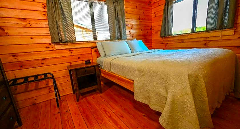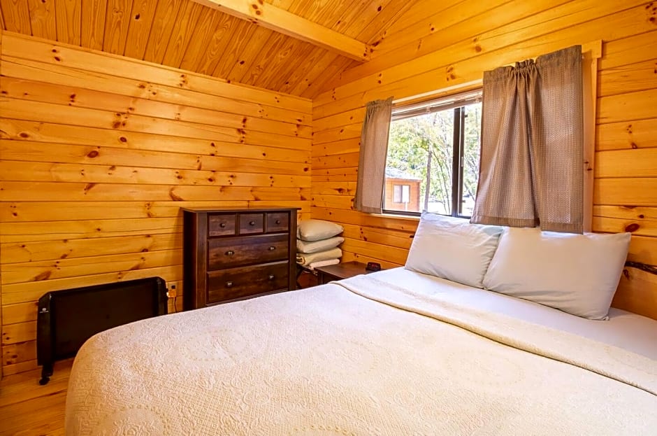The AC in the cabin was great, and the fan circulation kept the large bedroom cool at night. The kitchen utensils were great too! And the lake is very pretty to stay off of.