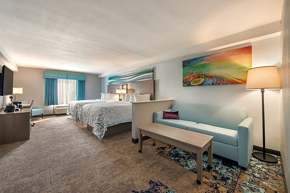 Indulge in royalty at our King Neptune Suite with Two Queen Beds - a spacious and smoke-free haven measuring 452 sqft. With top-notch amenities including a private bathroom, bathtub, flat-screen TV, microwave, and refrigerator, this suite comfortably accommodates 4 adults and 3 children, offering a truly royal escape for your next retreat.