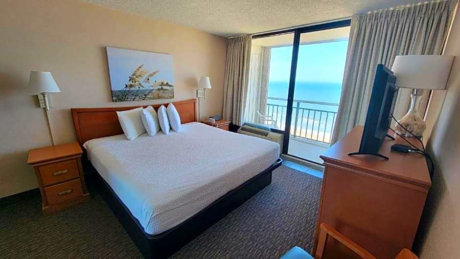 This room features a spa bath, a sofa bed, and a full kitchen. It has a balcony with ocean views.