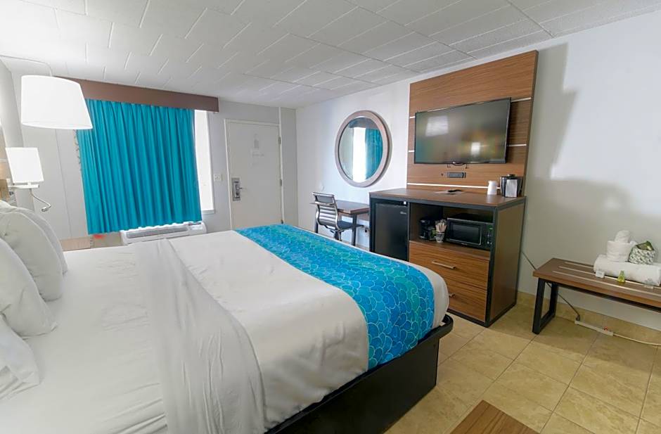 At Oceans 2700 hotel, there are two types of rooms available. The King Studio is a 248 sqft studio room that can accommodate 2 adults, with a non-smoking policy and a 1 King size bed. The Queen Studio with Two Queen Beds is a slightly larger quadruple room, measuring 280 sqft, that can also accommodate 2 adults. It has a non-smoking policy and features 2 Queen size beds.