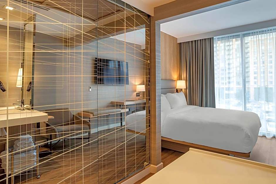 AC Hotel by Marriott Washington DC Convention Center offers a variety of room types including Family, Double, and Mobility Accessible rooms. The rooms range in size from 355 sqft to 377 sqft and can accommodate either 2 adults and 1 child or 4 adults and 3 children. Smoking is not allowed in any of the rooms. Bed sizes include King and Queen size beds.