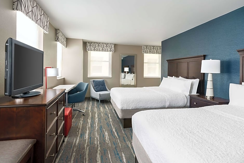 This hearing accessible, non-smoking room features two queen-sized beds. Perfect for stays of two or more guests, the room also has a visual alarm and notification devices for the doorbell or door knock and incoming phone calls. The modern décor includes two plush Hampton beds, comfortable soft seating, an HDTV, and easy to operate alarm clock/radio. In the bath, you will find a range of thoughtful amenities including a WaterPik shower head and curved shower rod. The free WiFi access will help you stay connected while on the road, and if you prefer not to work at the desk, you can use the convenient lapdesk instead. You'll also enjoy the convenience of having a coffeemaker with tea service as well as an iron with ironing board in your room. Any corresponding photo may not reflect the specific accessible room type or room feature.