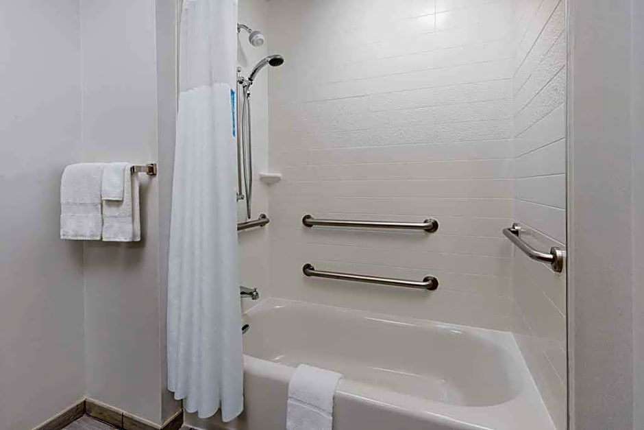 This mobility and hearing accessible, non-smoking room features one king-sized bed and an accessible bathtub. The room also has a visual alarm and notification devices for the doorbell or door knock and incoming phone calls. The room features comfortable soft seating, an HDTV and easy to operate alarm clock/radio. The free WiFi access will help you stay connected while on the road. If you prefer not to work at the desk, you can use the convenient lapdesk instead. You'll also enjoy the convenience of having a coffeemaker with tea service as well as an iron with ironing board in your room. Any corresponding photo may not reflect the specific accessible room type or room feature.