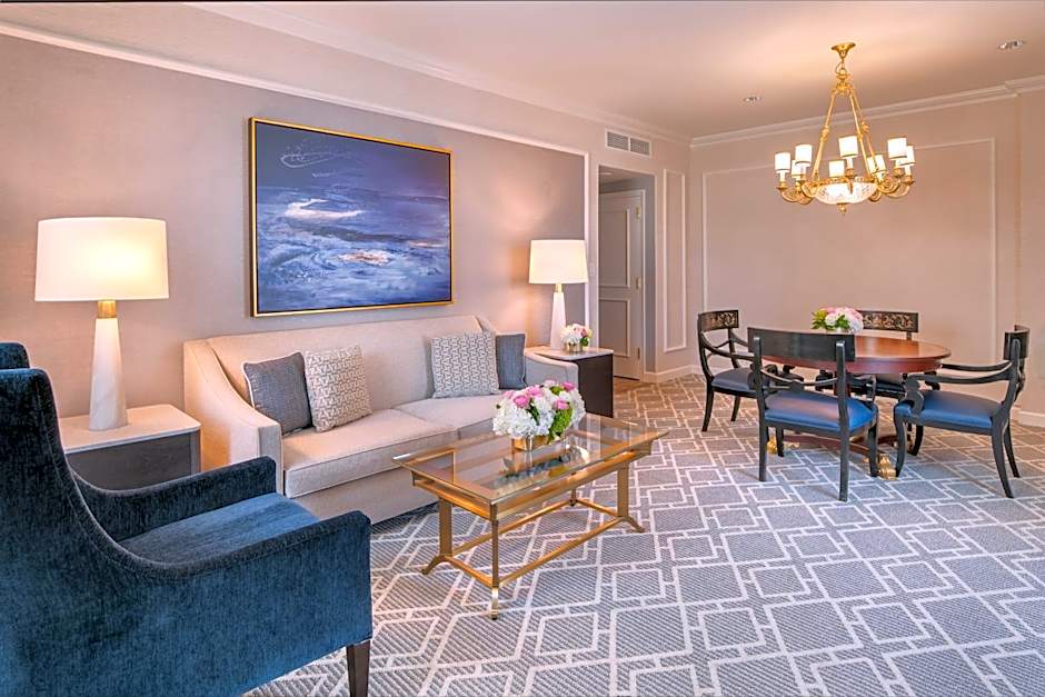 Overlooking the hotel’s courtyard, this 1425 sqft suite features a spacious living room with a dining table for eight and adjoining butler pantry, as well as a powder room, in-room safe and a premium coffee machine.