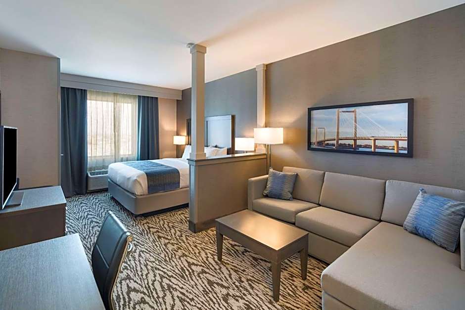 The Comfort Suites Kennewick at Southridge offers a variety of suites with different bed and room sizes. These include Queen Suites with Two Queen Beds and a Sofa Bed, Queen Suites with Two Queen Beds, King Suites with and without accessible features, and King Suites with a Sofa Bed. All rooms are non-smoking and can accommodate a range of adults and children.