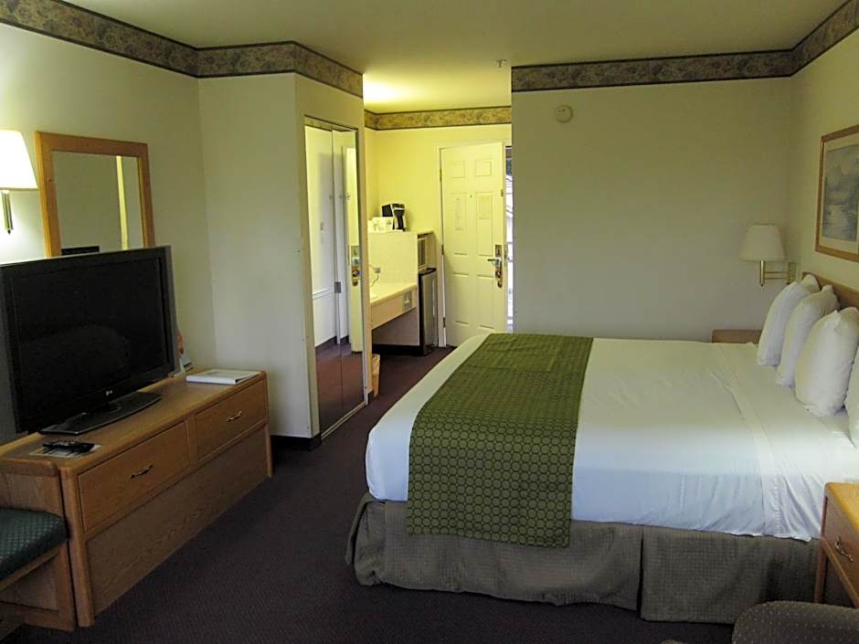 This single king room features air conditioning, seating area and microwave.