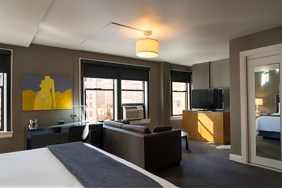 Featuring 375 square feet of hang-out space, our bunk rooms accommodate up to five people and feature a separate seating area fitted with a sectional couch, coffee table, 42-inch TV and Crosley record player with a curated collection of vinyl from Sub Pop Records. Designed for work and play, our bunk rooms include a working desk and plenty of built-in bed storage giving you the space to sprawl out and make yourself at home. 375 sq ft - Full and Three Twin Beds Walk-in Shower Local and long distance calls Radio alarm clocks Robes Bluetooth speaker High-speed wireless internet 50" HD Cable TV 24-hour front desk Evening turndown service - available upon request In-room Smith tea In-room safe 24-hour fitness center Same day laundry or dry cleaning for fee Limo/town car service for fee Valet parking service for fee Copy and faxing service Shoeshine for fee Steaming services for fee In-room steamer - available upon request Your daily guest amenities fee of $22 plus tax also includes access to all of our exclusive amenities listed below: Complimentary Wi-Fi Paige, our Virtual Concierge Fitness center featuring Peloton bikes & MIRROR Complimentary bike rentals to explore the city Complimentary beer at check-in Morning coffee service Well+Fit Kit Car charging station Sleep Experience Spiritual Menu Pet Amenities Accredited Cleaning Services