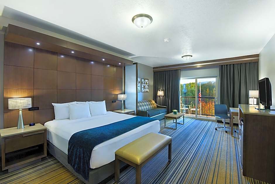 The hotel offers a variety of rooms including 2 Queen Suites, River View King Suites, River View Executive King Suites, King Suites, Deluxe 2 Queen Suites, and Executive King Suites. All rooms are non-smoking and can accommodate 4 adults and 3 children. Room sizes range from 323 sqft to 452 sqft, and bed options include Queen size beds, King size beds, and Sofa beds.