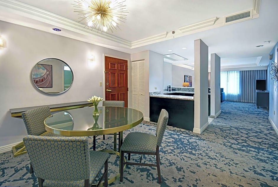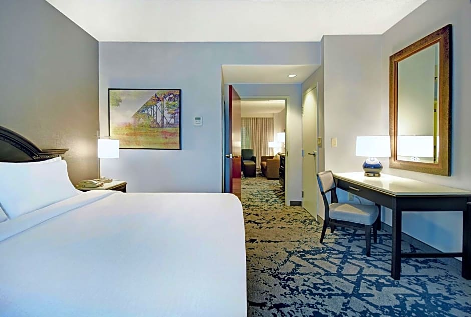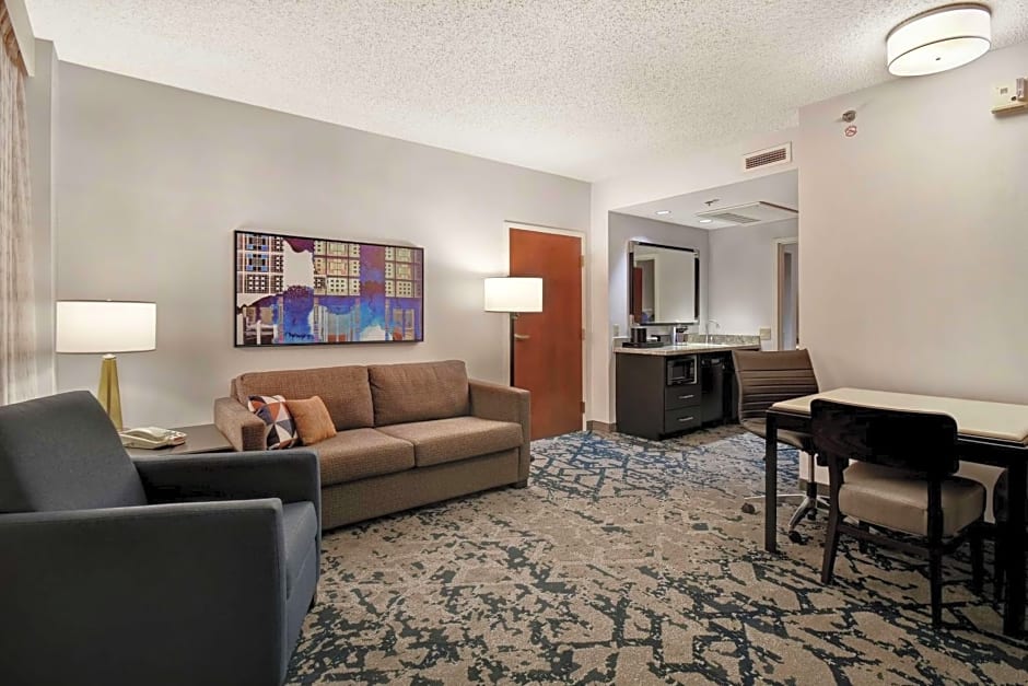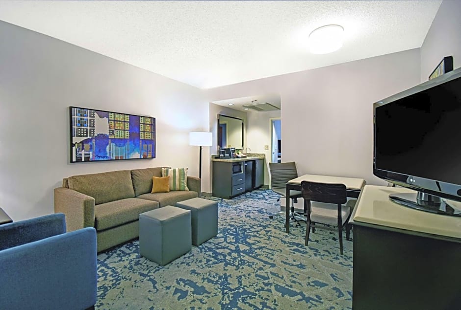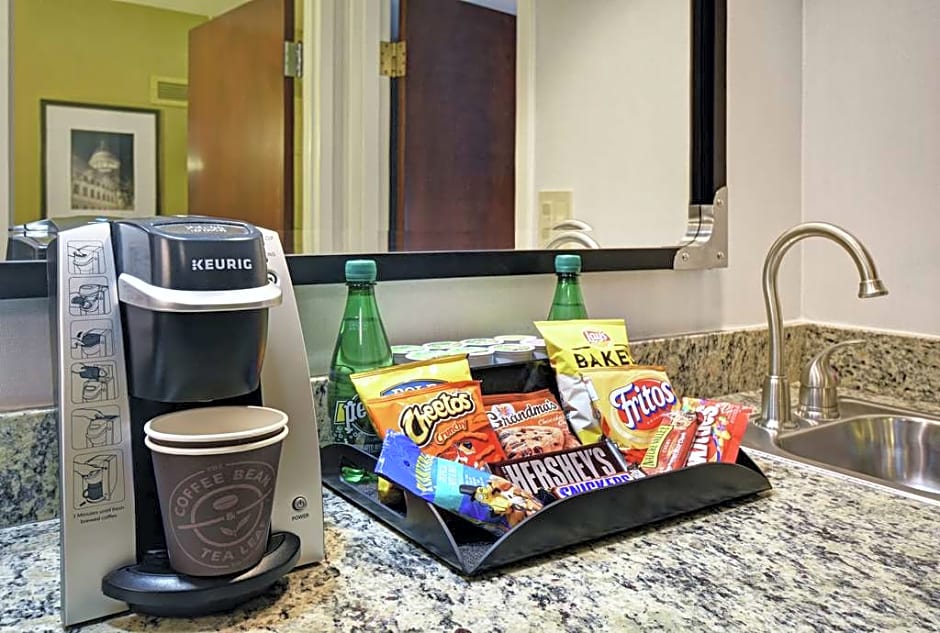 Refreshment Center, WiFi, Keurig coffee brewer, cooked-to-order breakfast, Evening Reception. Check in to this premium one-bedroom suite, featuring one king-sized bed and a separate living room with sofa bed. This suite also features a microwave, mini-refrigerator and dining table. Sit back in the armchair or on the sofa and watch the 37-inch flat-screen TV, with cable channels and pay-per-view, or surf the web using WiFi (fees apply). Refreshment Center access, WiFi, and a Keurig coffee brewer are all included in our Premium Suites. Refreshment Centers on these floors come stocked with non-alcoholic beverages, and snacks. All of our suites include a complimentary cooked-to-order full breakfast and Evening Reception, featuring beer, wine, premium spirits and light snacks.