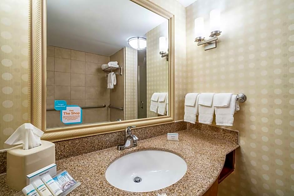This mobility and hearing accessible standard room features one king-sized bed, and a roll-in shower. The room also has a visual alarm, and notification devices for the doorbell or door knock and incoming telephone calls. Roll-in shower with attached accessible seating, lowered vanity in bathroom, and lowered closet shelf. The ergonomic Mirra chair by Herman Miller is good for your back and better for work. Enjoy your favorite television show on our 36-inch HDTV. There's also a microwave, refrigerator and coffee/tea maker to help you feel at home. And for conducting business, our rooms ensure your productivity thanks to the spacious work desk, two telephones with dataport and voicemail and complimentary WiFi access. Any corresponding photo may not reflect the specific accessible room type or room feature.