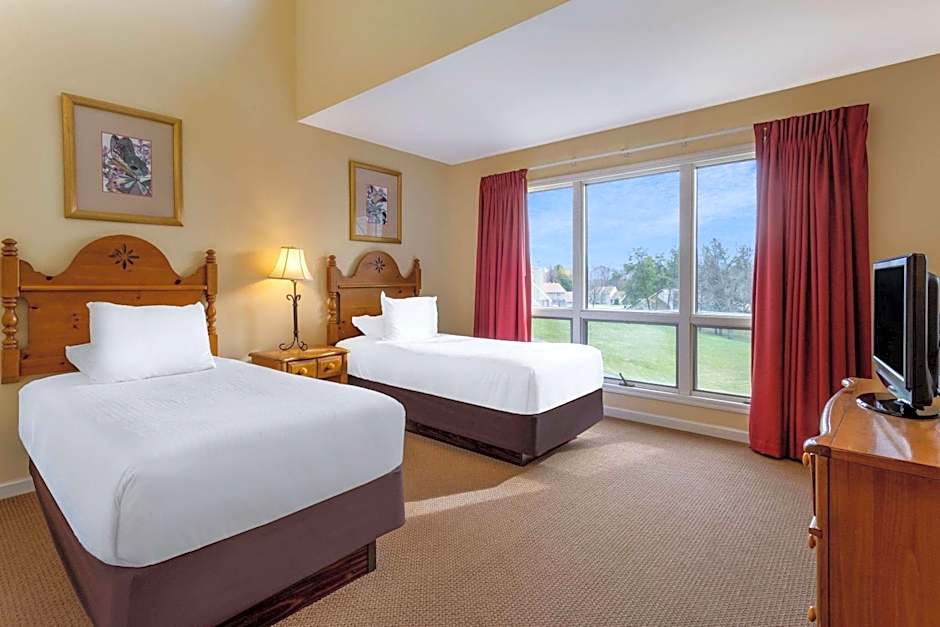 Tamarack Wisconsin Dells, a Ramada by Wyndham, offers a variety of rooms including two-bedroom apartments, one-bedroom apartments, and queen studio suites. All rooms are non-smoking. The two-bedroom apartments accommodate 6 adults and 4 children, offering one queen bed, two twin beds, and one sofa bed or two queen beds. The one-bedroom apartments and queen studio suites accommodate 4 adults and 3 children, with beds consisting of one queen bed and one sofa bed.