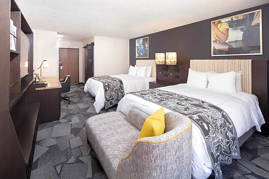 At Saint Kate - The Arts Hotel, the types of rooms available include Deluxe Two Queens, This Time Tomorrow Room, Oversize Corner King with Seating Area, Deluxe King Hearing Accessible, Superior King with separate living room area, Deluxe 2 Queen Beds Hearing Accessible, Deluxe Two Queen Accessible Bathtub with Study Access, Deluxe King Roll in Shower with Study Access, Deluxe King Room, Deluxe Two Queen Roll-In Shower, The Canvas Queen by John Grant, Deluxe Queen Room, The Studio King, The Canvas King by Reed Skocz, Deluxe Two Queen Hearing Accessible with Study Access, Superior King Room, and Deluxe King Accessible Bathtub. The rooms can accommodate between 2 to 4 adults, along with 2 children. Smoking is not allowed in any of the rooms. The bed sizes range from Queen to King, with some rooms also featuring a sofa bed.