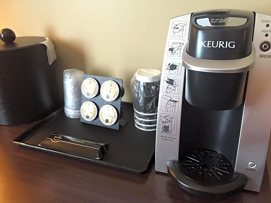 This room includes a microwave, mini fridge, coffee maker, hairdryer, iron and ironing board.
