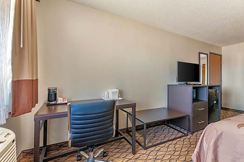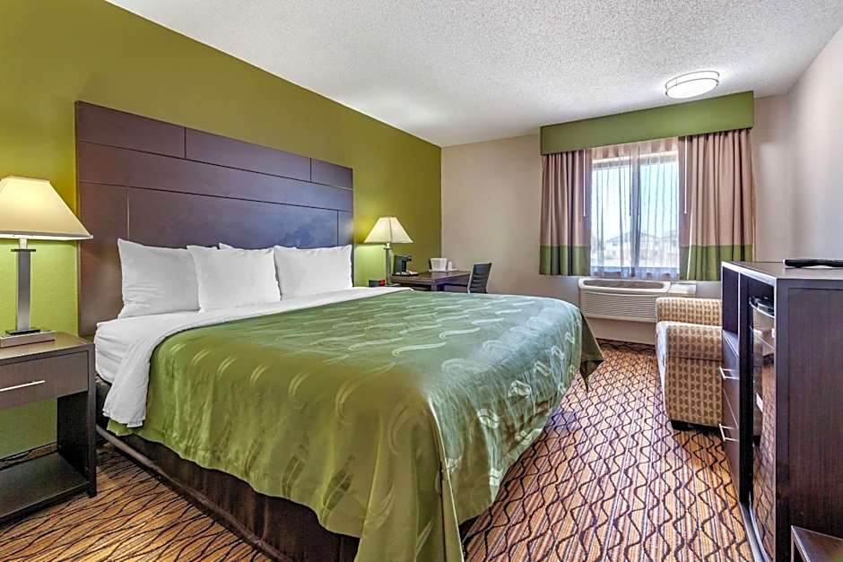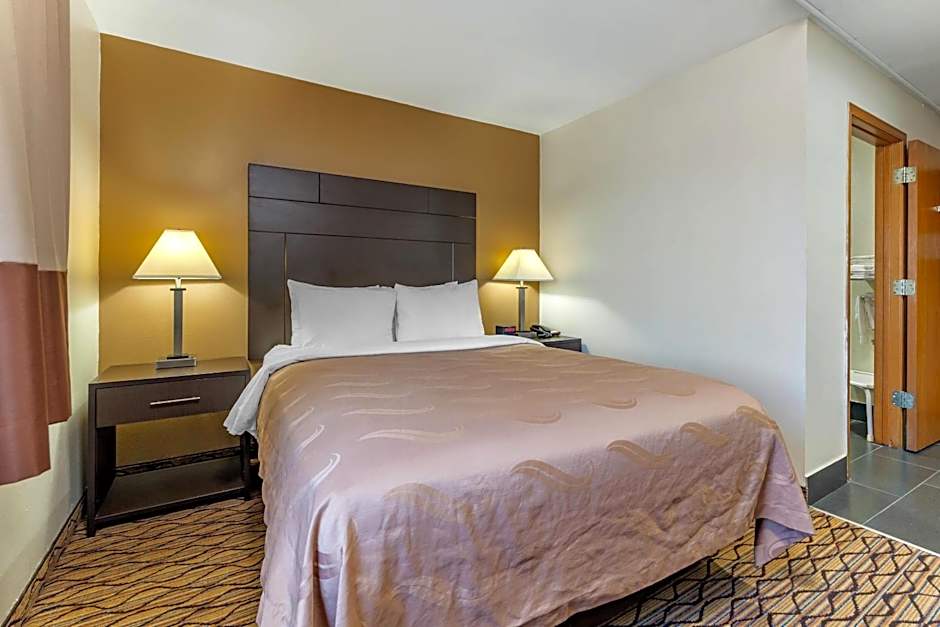 At the Quality Inn hotel, there are various types of rooms available. These include standard queen rooms with two queen beds and a sofa bed, queen suites, queen rooms with disability access, standard king rooms, and king suites. All rooms are non-smoking. The occupancy varies, accommodating between 2 and 5 adults, with bed sizes consisting of queen or king beds, some with additional sofa beds. The room sizes range from 301 sqft to 452 sqft.