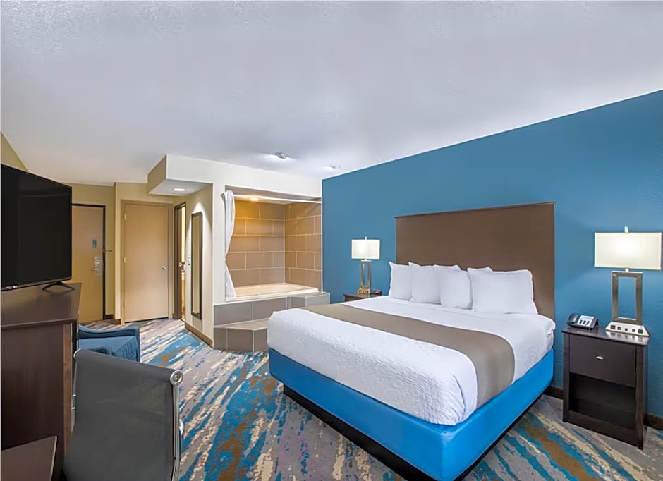 Large very clean room. Even supplied 2 toothbrushes on the counter. I booked a room that had a whirlpool, (it was a cheaper rate that night) not realizing that it wouldn't have a separate shower. I didn't try climbing into it. We did use the hot tub by the pool. Temp was great, not a lot of pressure but it was fine. Pool was too cool for us. Breakfast was standard waffles, scrambled eggs and sausage. We went down the street a block to Huckleberries and their food is great.