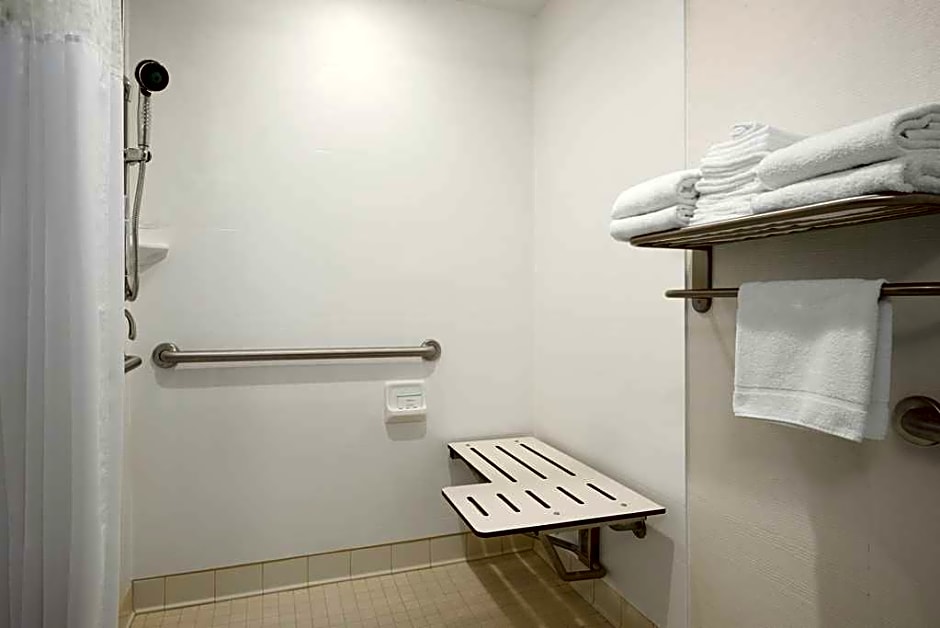 Completely remodeled in 2008, this spacious non-smoking room features our clean and fresh Hampton bed to surround you in luxury and comfort, comfortable easy chair with ottoman, 32" color LCD flat-panel HDTV, easy to operate alarm clock/radio and large work surface. Free high-speed internet access will help you stay connected while on the road. If you prefer not to work at the desk, you can use the convenient lapdesk instead. You'll also enjoy the convenience of having a coffee maker and iron/ironing board in your room. In the bathroom you'll enjoy fluffy towels, a WaterPik showerhead and curved shower rod that allows more light and space in the shower.This room also is a mobility and hearing accessible room and also features a roll-in shower.