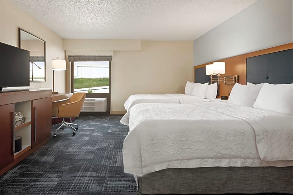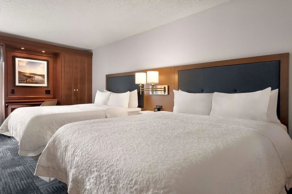 Completely remodeled in 2008, this spacious non-smoking room features two of our clean and fresh Hampton bed to surround you in luxury and comfort, 32" color LCD flat-panel HDTV, easy to operate alarm clock/radio and large work surface. Free high-speed internet access will help you stay connected while on the road. If you prefer not to work at the work space, you can use the convenient lapdesk instead. You'll also enjoy the convenience of having a coffee maker and iron/ironing board in your room. In the bathroom you'll enjoy fluffy towels, a WaterPik showerhead and curved shower rod that allows more light and space in the shower. This room also is a hearing accessible room.
