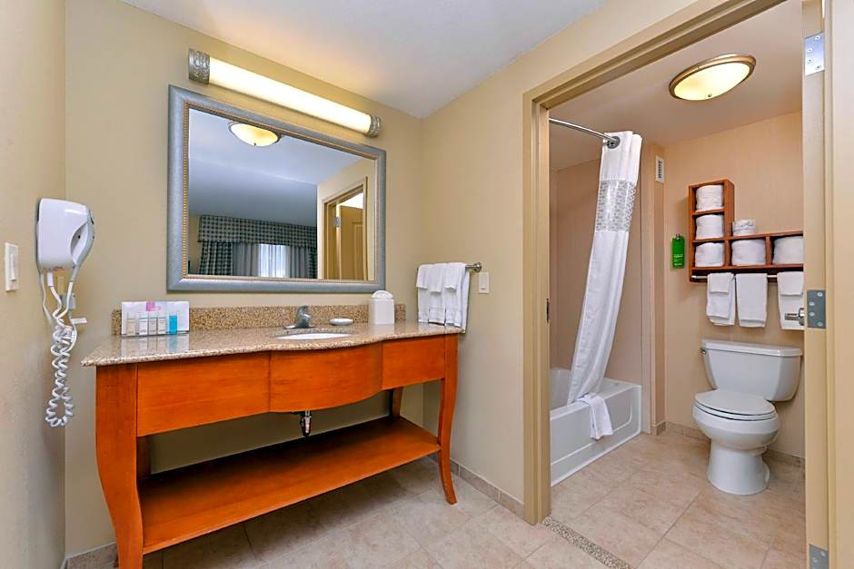 Whirlpool, sofa bed, microwave, fridge, desk, 32-inch TV, free WiFi Relax in this king studio suite with a clean and fresh Hampton bed® and whirlpool tub. Sink into the sofa bed and watch movies on the 32-inch HDTV. Surf the web with free WiFi. Catch up with work at the desk with ergonomic chair. Refresh your senses in the bathroom, complete with a bathtub, shower and plush towels. Enjoy the convenience of having a microwave, fridge and coffeemaker in the room.
