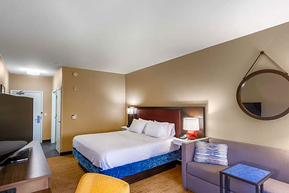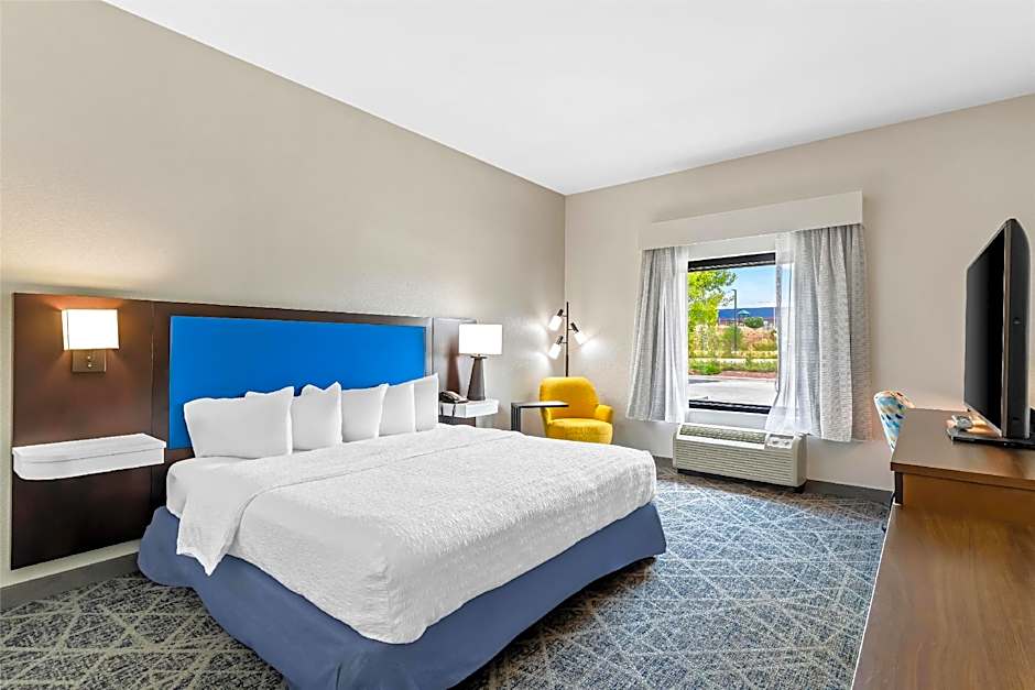 Any corresponding photo may not reflect the specific accessible room type or room feature. This hearing accessible, nonsmoking room features one king sized bed(s). The room also has a visual alarm and notification devices for the doorbell or door knock and incoming phone calls. The room features our luxurious Clean and Fresh Hampton Bed, comfortable soft seating, a HDTV, and easy to operate alarm clock/radio. In the bath you will enjoy a WaterPik shower head and curved shower rod. The free high speed internet access will help you stay connected while on the road. If you prefer not to work at the desk, you can use the convenient lapdesk instead. You'll also enjoy the convenience of having a coffee maker with tea service and iron/ironing board in your room.