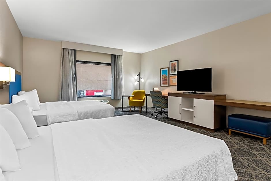 32-inch LCD TV, work desk, wet bar, dining table, coffeemaker, free WiFi access Enjoy a restful stay in this spacious deluxe room featuring two queen-sized clean and fresh Hampton beds® a 32-inch LCD TV and a large work desk. This suite also features a dining table and a wet bar with a microwave, a refrigerator and a coffeemaker. Free WiFi access will help you stay connected while on the road. The bathroom contains plush towels and a shower featuring a curved shower rod for added space and light.