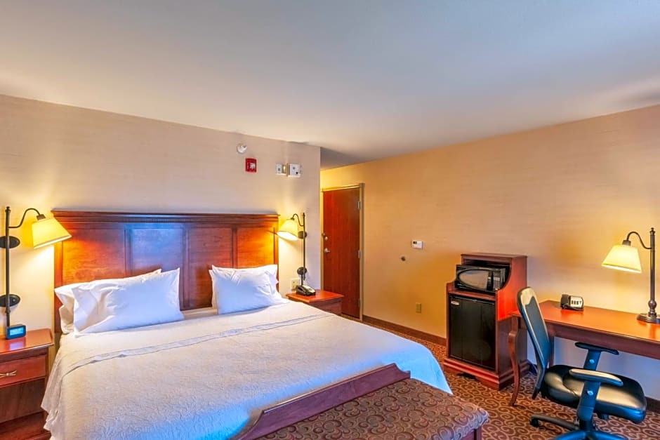 This hearing accessible, non-smoking room features one king-sized bed. The room also has a visual alarm and notification devices for the doorbell or door knock and incoming phone calls. The room features our clean and fresh Hampton bed, comfortable soft seating, microwave, refrigerator, a 32-inch flat-screen HDTV, and easy to operate alarm clock/radio. In the bath you will enjoy a WaterPik showerhead and curved shower rod. The free WiFi access will help you stay connected while on the road. If you prefer not to work at the desk, you can use the convenient lapdesk instead. You'll also enjoy the convenience of having a coffeemaker with tea service and iron/ironing board in your room. Any corresponding photo may not reflect the specific accessible room type or room feature.
