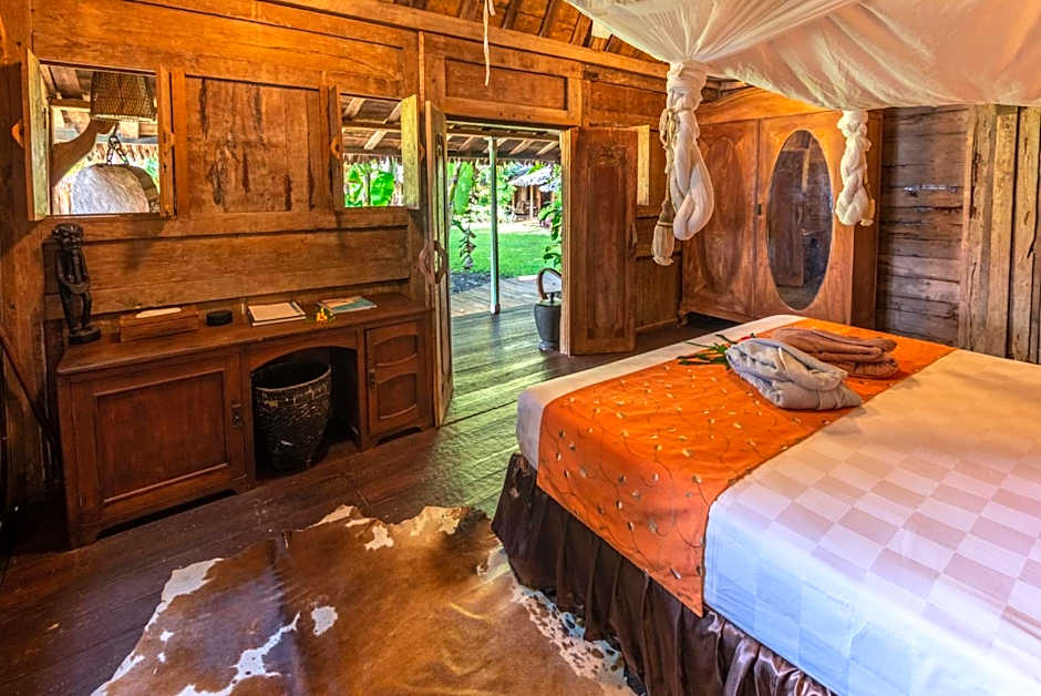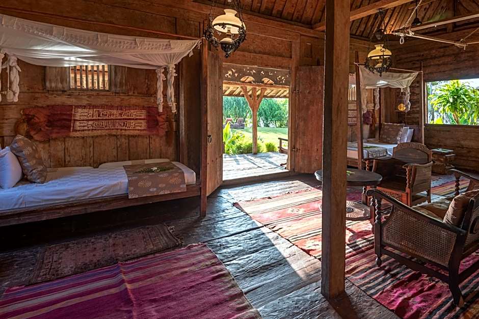 The Deluxe Beachfront Villa consists of two vintage teak villas complete with rustic furnishings. The master bedroom is linked by an external patio to the vintage bathroom. Ideal accommodations for a couple that wishes to relax in a timeless environment.