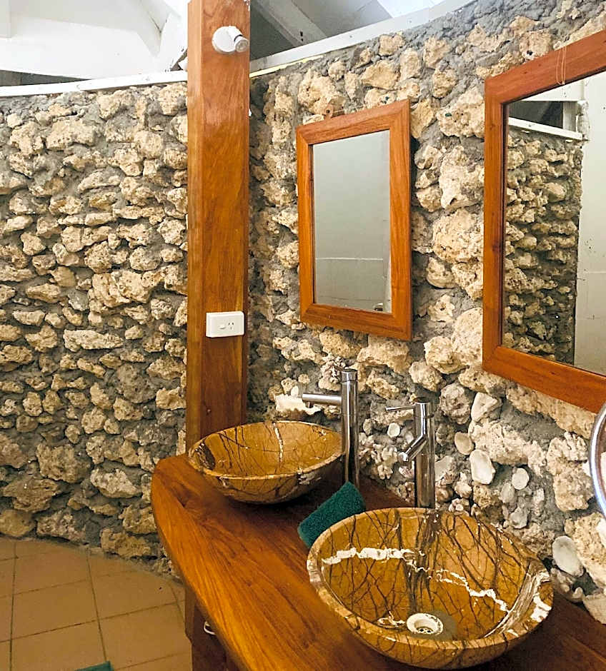 This bungalow features partial ocean views, handcrafted hardwood and wicker furniture, a refrigerator and a unique coral bathroom.