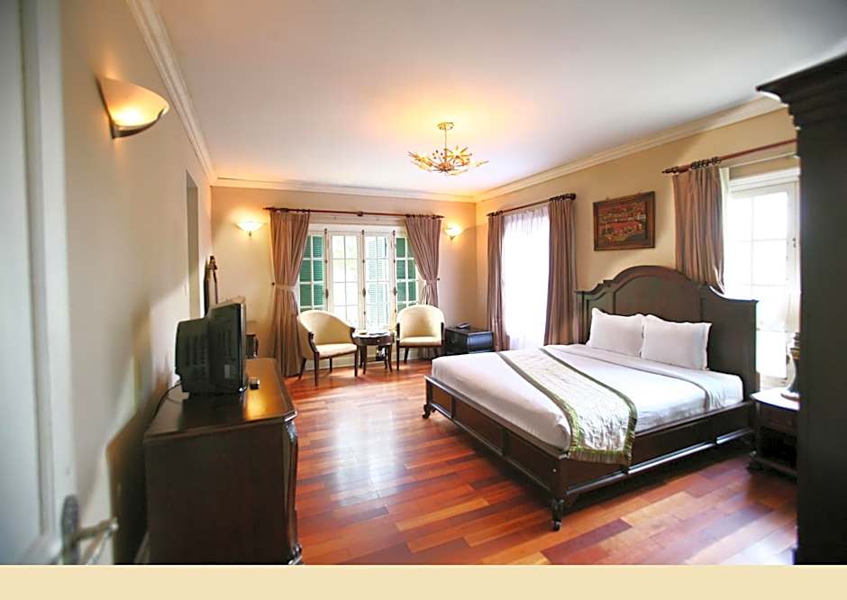 The Dalat Cadasa Resort offers a variety of rooms including Superior Double, Executive Double, Royal Double, Junior Double, Deluxe Double, Junior Twin, VIP Double or Twin, and Executive Twin. These rooms can accommodate 2 adults and 1 child, except for the Villas which can accommodate more. Smoking is not allowed in any of the rooms, with bed sizes ranging from Queen to King, and room sizes from 150 to 3767 sqft.