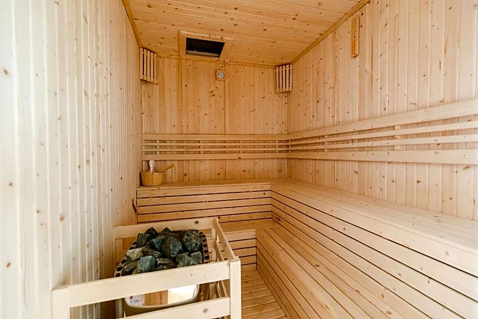 Highlights include an indoor swimming pool (free), private parking (free), and free Wi‑Fi, along with a fitness center and a sauna (free). On-site parking is free, and additional conveniences include a terrace, kitchen and kitchenware, non-smoking rooms, an elevator, a playground, a bidet, free toiletries, a balcony, and a garden. Shuttle service and airport shuttle are available for extra charges.