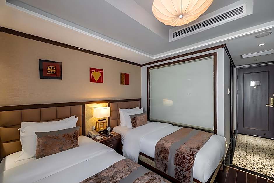 The Golden Lotus Luxury Hotel offers a variety of rooms including luxury suites with living rooms and sofas, executive double rooms with views, deluxe twin and double rooms with internal views, twin rooms with city views, family double rooms, and junior suites with balconies. The hotel does not allow smoking in any of its rooms. The rooms accommodate either 2 adults and 1 child or 4 adults and 2 children and have bed sizes ranging from Queen to King.
