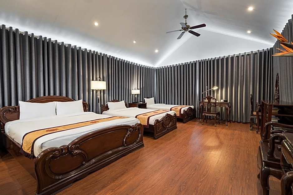 Mashing together modern furnishing and Vietnamese interiors, this room features a large window that overlooks the surrounding. It is fitted with an LCD flat-screen TV and a desk. Private bathroom is fitted with a bathtub.