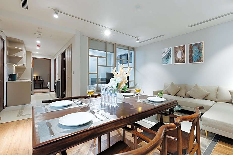 Accommodations span a wide spectrum of apartment styles, from compact studios to generous two-bedroom layouts and even duplex configurations. Studio options sit in the low hundreds of square feet, while larger choices surpass 1,700 square feet, with lake, garden, or horizon views available. Each unit comes with a kitchen setup, a balcony or patio, and non-smoking, soundproofed design for a restful Hanoi stay.