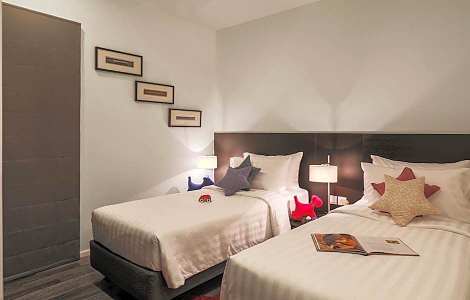 The hotel offers a variety of apartment rooms ranging from one to four bedrooms. The rooms do not allow smoking and feature a mix of bed sizes including King, Queen, and Twin beds. Occupancy capacities vary from 2 adults to 8 adults with additional space for children.