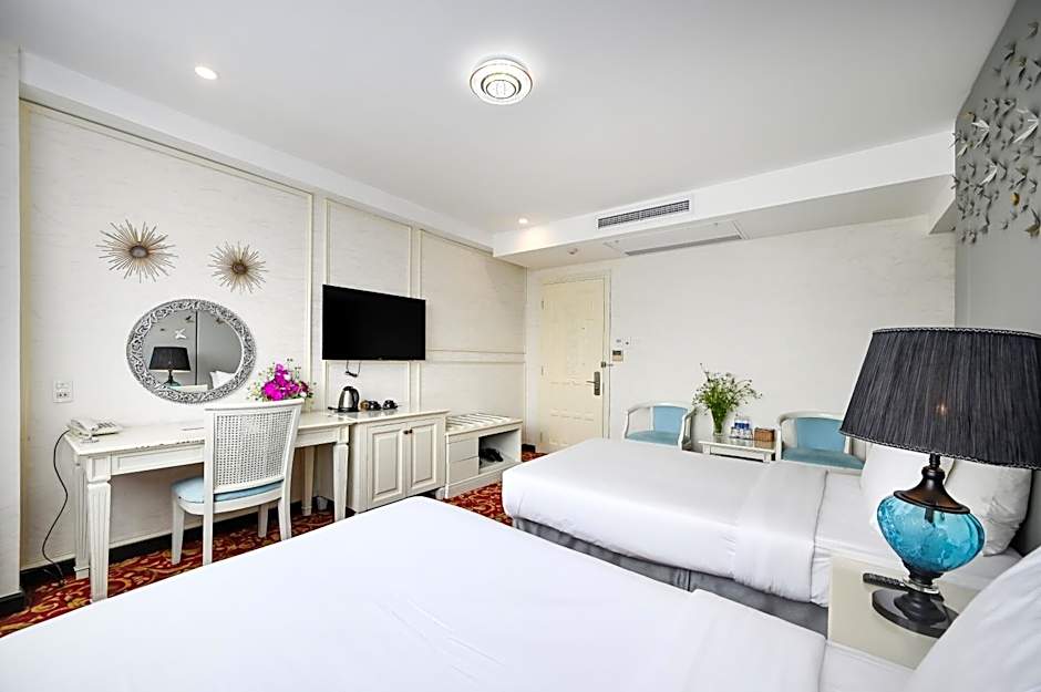 The California Hotel Saigon offers a variety of room types including King Rooms, Deluxe Double Rooms, Deluxe Twin Rooms, Twin Rooms with View - single occupancy, Deluxe Triple Rooms, and Suites with City View. The rooms range in size from 194 sqft to 301 sqft. Smoking is not allowed in any of the rooms. The accommodations can vary from single occupancy to accommodating up to 3 adults and 1 child. The beds in the rooms include Queen size beds, Twin beds, or a combination of both.