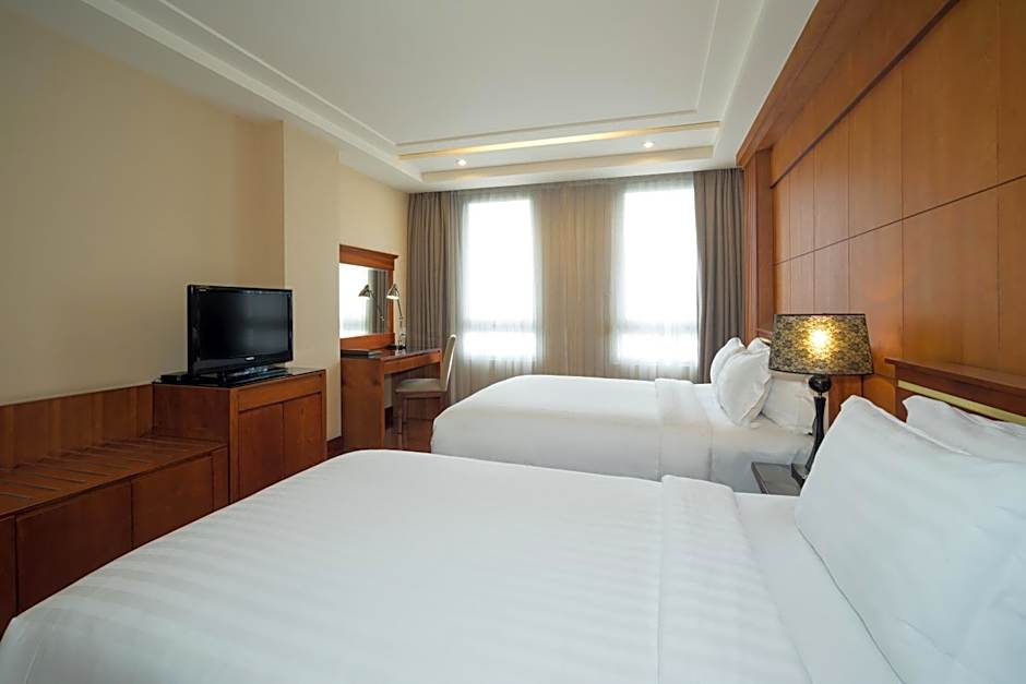 The hotel offers rooms of various types, such as Superior Double Room without Window, Junior Suite with City View, Deluxe Double or Twin Room with City View, Business Single Room without Window, and Premium Deluxe Triple Room with City View. Smoking is not allowed in any of the rooms. The rooms can accommodate different numbers of adults and children, ranging from 1 adult in the Business Single Room to 3 adults and 1 child in the Premium Deluxe Triple Room. The bed sizes vary, including Queen size, King size, and Twin beds.