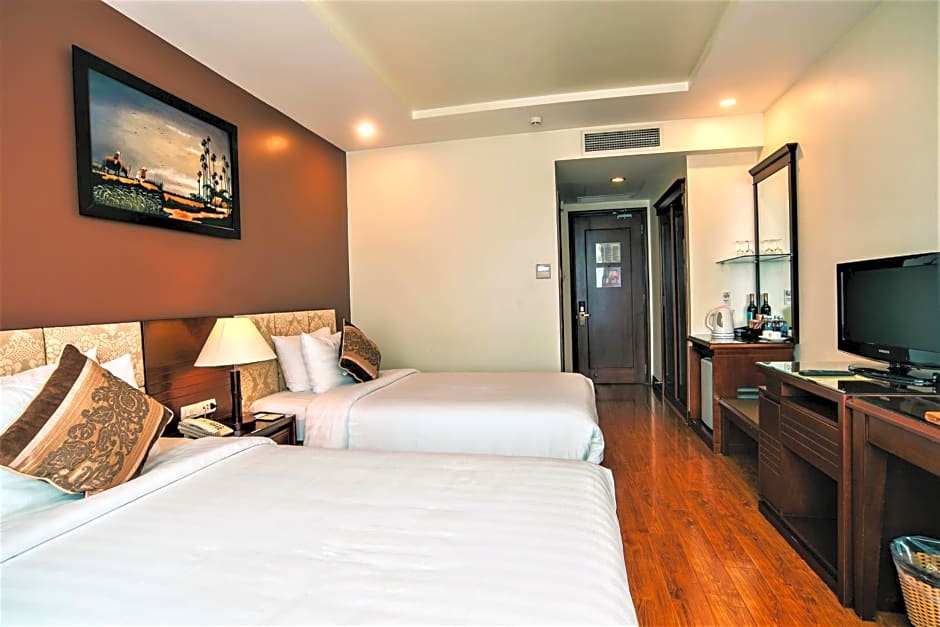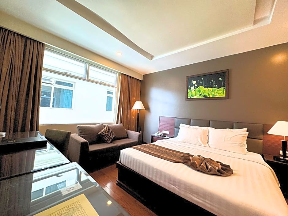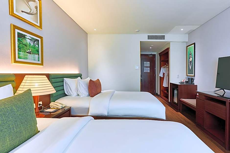 The Northern Saigon Hotel offers a variety of room types, including Deluxe Window Twin Rooms, Suites, Deluxe Window Double Rooms, Grand Deluxe Double Rooms, Family Suites, Premier Deluxe Twin Rooms, and Premier Deluxe Double Rooms. The rooms range in size from 301 sqft to 538 sqft. All rooms are non-smoking and can accommodate either 2 adults and 1 child or 3 adults and 2 children, depending on the room type. The beds in the rooms vary, with options including twin, queen, and king size beds.